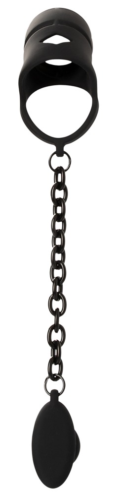 Den flexibla och anatomiskt formade silikonbur huserar penisen medan de elastiska ringarna fästs runt testiklarna för att hålla allt på plats. Analpluggen förs in i anus och kopplingskedjan ger en spännande dragning och stimulerar mellangården.