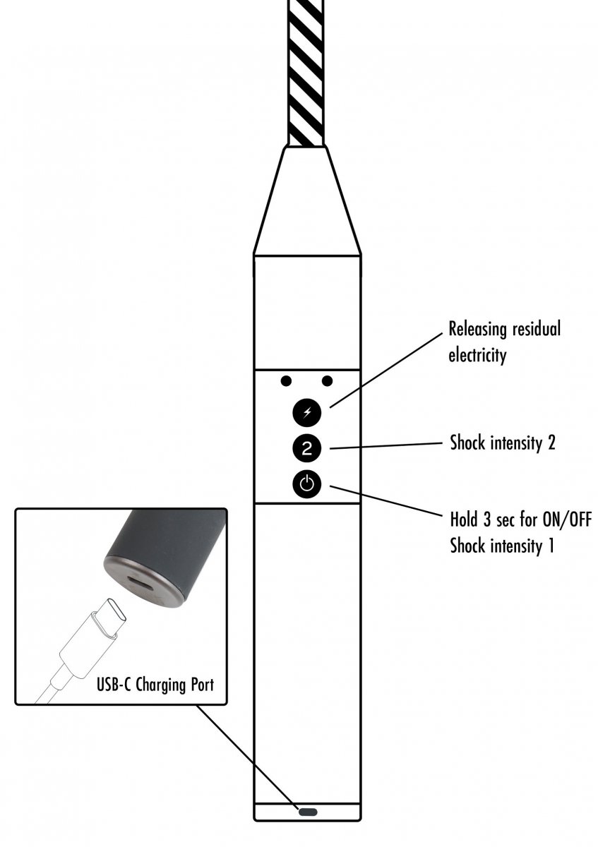 Med en totallängd på 55 cm ger denna el-käpp dig en imponerande räckvidd och precision. Det gummerade handtaget ligger bekvämt i handen och ger ett stadigt grepp, även under de mest intensiva sessionerna. Materialkombinationen av PU-läder, ABS-plast och ledande metall säkerställer både hållbarhet och maximal effekt.