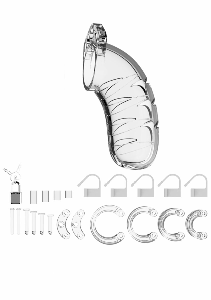 ManCage 04 Chastity Cage är tillverkad av högkvalitativt polykarbonat, som är ett mycket lätt, hållbart och allergivänligt material. Buren består av tre delar för att skapa en makalös passform ihop. De två styrstiften förbinder de övre delarna och det ovala koniska stiftet förbinder ringarna med buren. En mängd olika ringar i olika storlekar och distansdelar gör att du kan skapa den perfekta storleken! boren har en bekväm passform och är använda. Med ett metall lås eller tie-wrap-lås gör du buren garanterat inbrottssäker . De medföljande tie-wrap-låsen är 100% diskreta och säkerställer att de inte utlöser larmet från någon metalldetektorer på, festivaler eller till och med flygplatser! vilket gör att du tryggt och säkert kan hänge dig vart som helst. när en använder en Kuk-bur är mycket viktigt därför är ManCage-serien utrustad med en mängd olika ventilations öppningar och en urineringsöppning, vilket gör det lätt att uträtta behov och skölja av, efter användning är den enkel att plocka itu och rengöra och desinficera, smidigaste sättet att göra rent buren är med en leksaksrengöring eller ljummet vatten och en antibakteriell tvål , Buren gör det omöjligt att få full erektion, leken blir på så sätt ännu hetar och mer intensiv och vi vet ju alla vad dom säger "den som väntar på något gott" ManCage 04 Chastity Cage ger nyckelinnehavaren optimal makt över utlösning och erektion