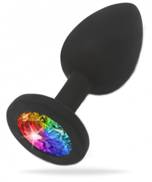 Här har du en häftig svartfärgad analplugg med en sensuell flerfärgad glasdiamant på basen. Diametern är 2.5 cm och 7 cm lång som är tillverkad av en klassisk silikon material, materialet gör att med hjälp av vattenbaserad glidmedel så kommer sexleksaken att glida in smidigt i ett hål så att du får känna den sköna känslan när du får något i dig i annalen. När analpluggen är inne i dig så kan du skåda den vackra tjusiga regnbågsfärgade glasdiamanten.