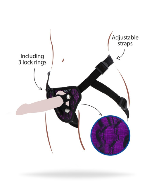 Det här är en perfekt sele för dig och din partner att utforska nya sätt att njuta tillsammans. Med de olika storlekarna på silikonringar kan ni enkelt anpassa sele till olika dildos för att passa era önskemål. I paketet får du med dig 3 olika ringar med storlek 3,5cm, 4,5 cm och 5cm som är tillverkad i silikon. Denna är dekorerad med fin svart/lila spets på framdelen, det får dig att se väldigt elegant och sexig ut! Den har banden runt benen till under rumpan så den sitter riktigt bekvänt och skär inte in i slidan eller runt analen, detta gör också att du är öppen för penetration för egen del i både slida och anal. Andra remmen sitter bekvämt runt höften så du har full kontroll över din strapon. Det ingår inte en dildo i detta paketet, endast ett harness. Du finner alla passande dilon med sugkopp som bas här.