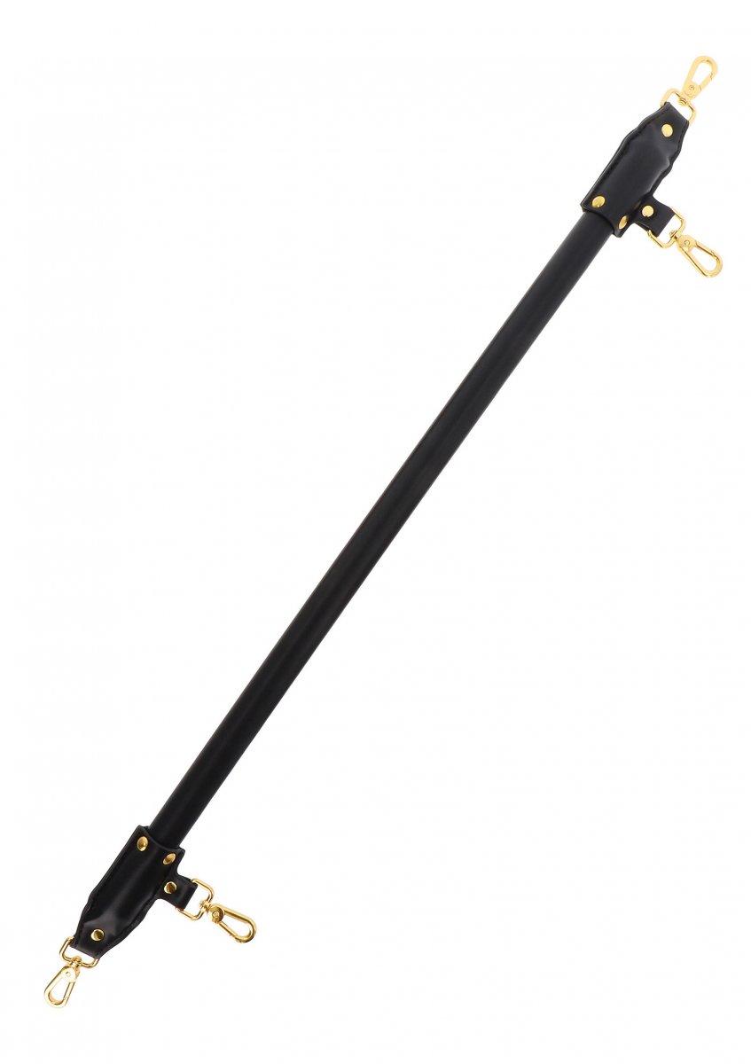 Den lyxiga kombinationen av svart faux läder och skimrande guldtonade detaljer gör denna spridarstång till ett smycke i din samling av sexleksaker. Den är lika estetiskt tilltalande som den är funktionell, och den smidiga ytan känns behaglig mot huden.